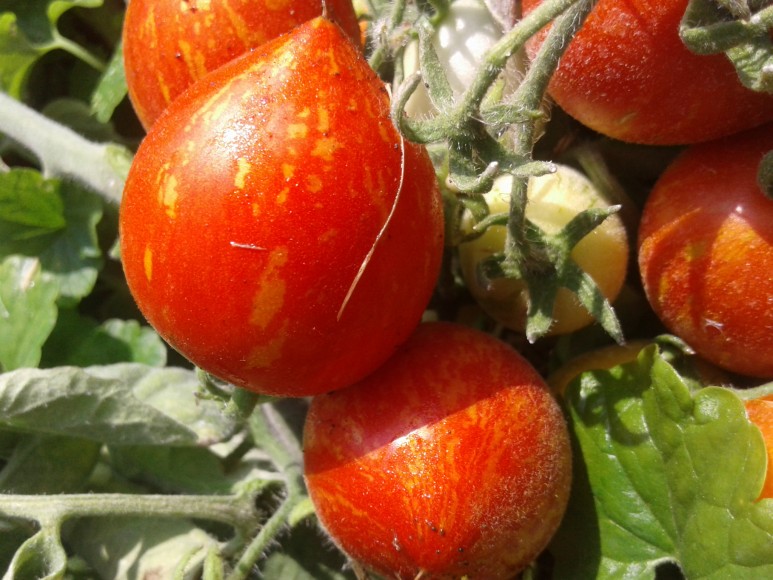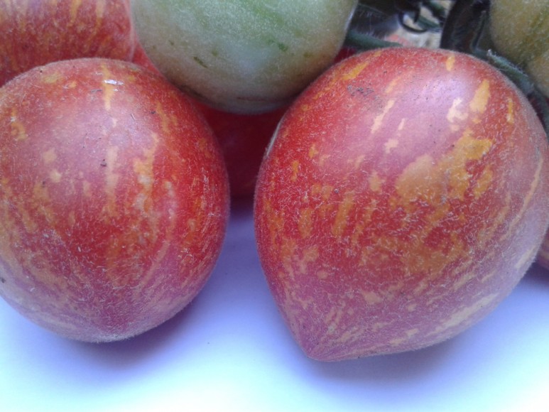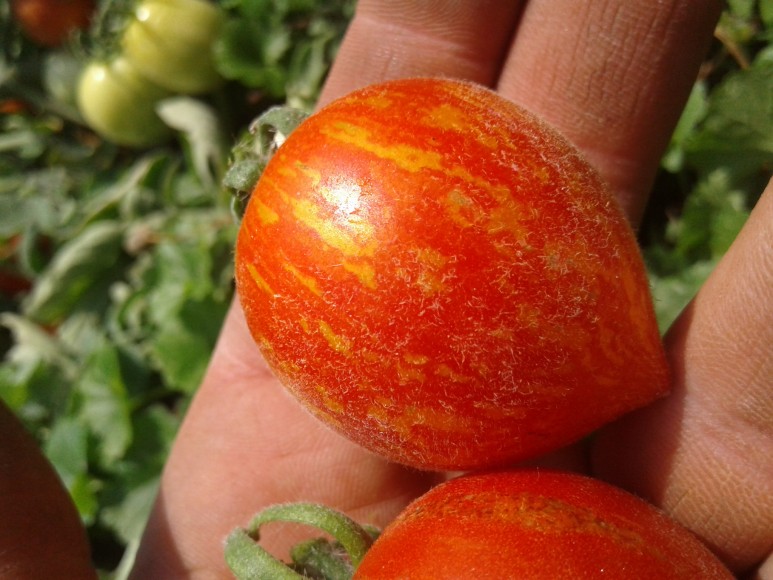 Eine gute Freiland Tomate, die bodennahen Früchte der niedrigen Pflanze haben einen würzigen Geschmack,rot-gelb gestreifte und behaarte große 3-4cm, runde Tomate. Die Pflanze ist grau-grün behaart, das Ausgeizen erübrigt sich. Die Sorte am besten im Topf oder Hochbeet pflanzen. Die Schale ist trotz der Behaarung weich.