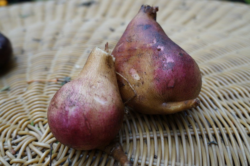 Gut zu Wissen Yaconstaude mit Knollen die zur Hälfte weiß und rot gefärbt sind. Die meisten Knollen sind rundlich geformt. Geschält können rohe Wurzelknollen sofort verspeist werden.Die Knollen dieser vitalen Staude schmecken süß und sind fester in der Konsistenz knackiger als bei anderen Sorten, werden auch gekocht gegessen. Wenn nach den ersten Frösten das Laub abstirbt, kann geerntet werden Ende Oktober. Wir bieten getopfte Pflanzen an, keine losen Knollen.