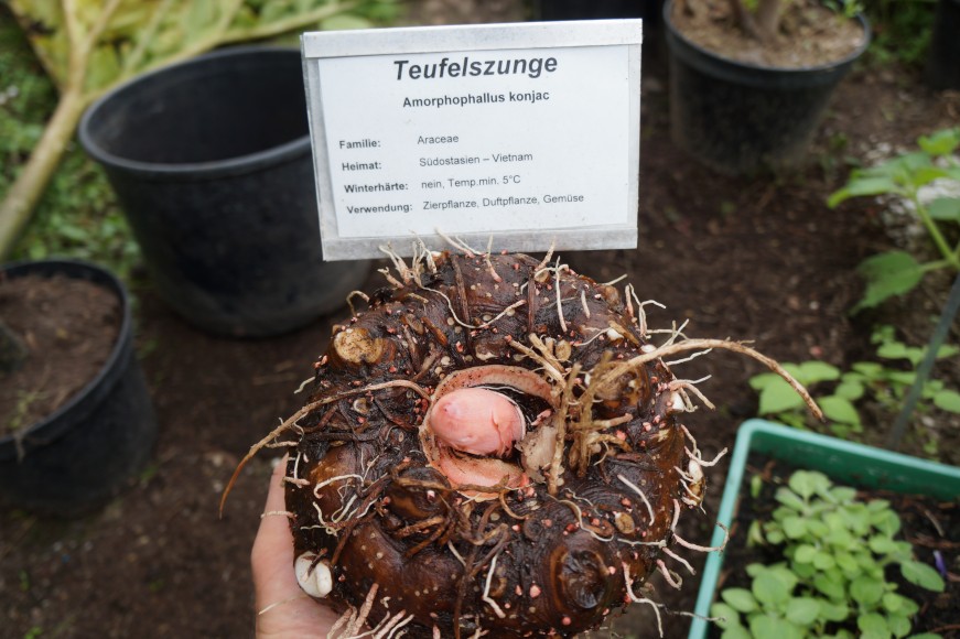 Gut zu Wissen Die Konjakwurzel ist eine seltene, aber wenig anspruchsvolle Kübelpflanze. Ab einem Gewicht der Knolle von etwa 500g bildet sich im zeitigen Frühjahr eine recht imposante Blüte (50 Zentimeter hoch), die ähnlich streng riecht wie beim großen Bruder Titanwurz (Amorphophallus titanum), anschließend kommt das baumförmige Blatt. Das Konjakmehl (E 425) kommt gelegentlich in Lebensmitteln zum Einsatz z.B. Pudding, Grütze, Soßen mit Konjakmehl als kalorienloser Sahneersatz. Konjaknudeln sind von gummiartiger Konsistenz, riechen nach altem Fisch, schmecken aber nach nichts. Dafür enthalten sie kaum Kalorien.Dieses Aroma verflüchtigt sich durch das Kochen oder Anbraten. Die Vegetationsperiode dauert von März bis September. Die restliche Zeit des Jahres übersteht sie als blattlose Knolle.